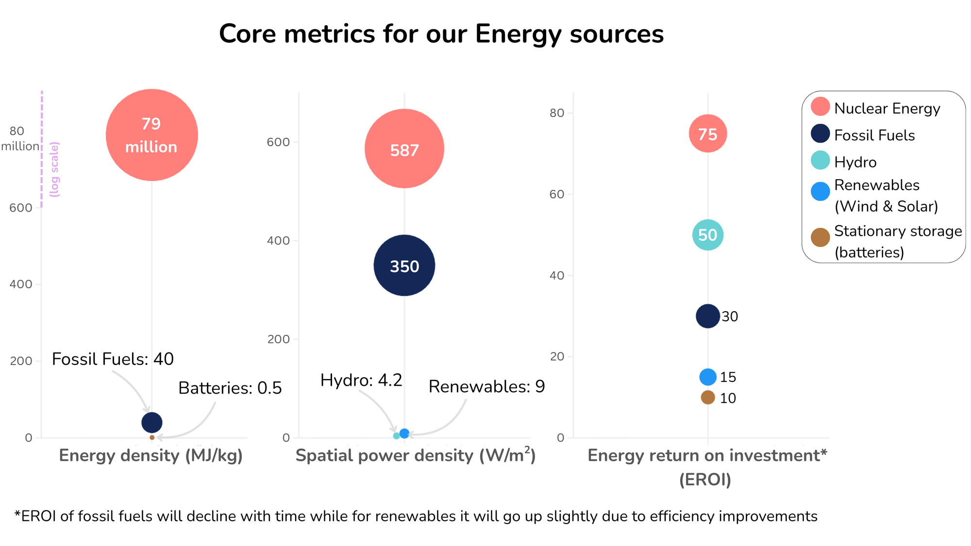 Only Nuclear energy is better than fossil fuels in their spatial power density as seen in the visual above, but it faces persistent challenges: difficulty for nuclear fission to achieve unit cost parity with renewables due to limited economies of scale, uranium ore quality decline and nuclear waste disposal while nuclear fusion still far away from commercial deployment. Despite these challenges, there are global efforts on the nuclear path of MPP— significant funding in nuclear fusion development and continued enrichment of Uranium for nuclear fission power. The nuclear path of MPP is more eco-friendly than fossil fuel path of MPP but our current burgeoning energy demand doesn't give us the time to make the complete switch from fossil fuels to nuclear.