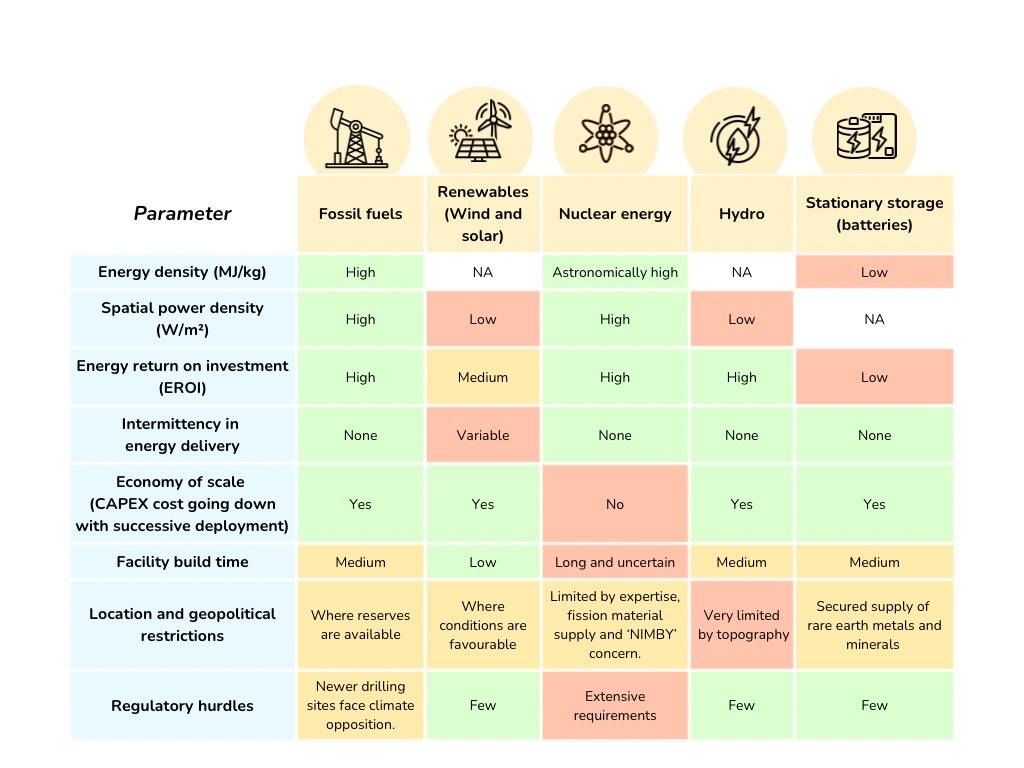 Replacing fossil fuels with renewables like wind and solar or nuclear or batteries is not a straightforward replacement, as seen from the qualitative analysis of multiple parameters in the table below.